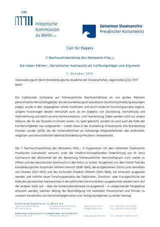 Das Nachwuchsnetzwerk Hiko_21 wird unter der inhaltlich-konzeptionellen Federführung von Frau Dr. Irena Kozmanová und in Kooperation mit dem Geheimen Staatsarchiv Preußischer Kulturbesitz am 7. Oktober 2019 seinen 7. Nachwuchsworkshop durchführen. ‚Die lieben Kleinen… Dynastischer Nachwuchs als Hoffnungsträger und Argument‘ lautet der Titel der Veranstaltung. Mit dem Workshop soll der Frage nachgegangen werden, welchen Beitrag die Beschäftigung mit konkreten Prinzessinnen und Prinzen zu unserem Verständnis von frühneuzeitlicher Herrschaftslegitimation und -festigung allgemein zu leisten vermag. Dabei soll über die Hohenzollerndynastie hinausgehend in vergleichender Perspektive erforscht werden, wie Nachwuchs als Argument, Instrument und integraler Bestandteil frühneuzeitlicher Herrschaft eingesetzt wurde.