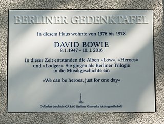 Am 8. Januar 1947 im Londoner Stadtteil Brixton als David Robert Jones geboren, stieg der Musiker a.k.a. David Bowie nach 1969 zu einem der einflussreichsten und erfolgreichsten Musiker der vergangenen Jahrzehnte auf. Seinen Durchbruch brachten der Titel Space Oddity und die Kunstfigur Ziggy Stardust. Mit zahlreichen Welthits prägte der Superstar die Popmusik; ca. 140 Millionen verkaufte Platten zeugen von dem enormen Erfolg. Der Sänger, Komponist, Schauspieler, Tänzer und Maler erfand sich in schillernden Rollen immer wieder neu. Von 1976 bis 1978 lebte der Verwandlungskünstler in der Hauptstraße 155 in Berlin-Schöneberg. Hier in der geteilten Stadt gelang ihm nicht nur der Drogenentzug, vielmehr entstanden in den Kreuzberger Hansa Studios die legendären Alben Low und Heroes, die zusammen mit Lodger als Berliner Trilogie in die Musikgeschichte eingingen. Seine Berliner Zeit nannte Bowie eine seiner »überschwänglichsten, kreativsten Phasen meines Lebens«. Mit Heroes schrieb er die heimliche Hymne Berlins.