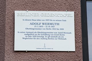 Adolf Wermuth (1855–1927), Oberbürgermeister von Berlin in den Jahren 1912 bis 1920, war Mitinitiator und Mitbegründer Groß-Berlins 1920. Gemeinsam mit anderen Befürwortern zur Schaffung Groß-Berlins gelang es ihm, nach der Revolution 1918/19 das politisch günstige Zeitfenster zur Durchsetzung der bereits jahrzehntealten Pläne zur Schaffung der Metropole zu nutzen. Er verstand es, zwischen den politischen Lagern zu vermitteln, um die zukunftsweisenden und modernen Reformpläne durchzusetzen. Wermuth konnte auf das Groß-Berlin-Gesetz entscheidenden Einfluss nehmen; das Gesetz ist unter anderem sein Verdienst.