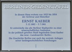 »Ernst Kaeber war ein begnadeter Wissenschaftler, ein erfolgreicher Archivdirektor in schwieriger Zeit, ein engagierter Kommunalpolitiker, er war ein leidenschaftlicher Berliner und ein Bürger von menschlicher Größe. Kaeber wurde im Dezember 1881 in Charlottenburg als Sohn des Direktors der Wasserwerke geboren. Ein nicht näher erklärbarer Hang zu historischer Erkenntnis, schreibt er in seinen Erinnerungen, habe sich bei ihm früh bemerkbar gemacht, so dass ihn der Weg nach dem Abitur am Joachimsthalschen Gymnasium 1901 zum Studium der Geschichte und der neueren Sprachen an die Universitäten in Berlin und Königsberg führte. Sein verehrter Lehrer an der Friedrich-Wilhelms-Universität wurde Otto Hintze. [...] Gemeinsam mit seinem Archivarskollegen Johannes Schultze ergriff er 1925 die Initiative zur Gründung der Historischen Kommission für die Mark Brandenburg und die Reichshauptstadt Berlin.« Lesen Sie weiter in Rosemarie Baudisch/Wolfgang Ribbe, Gedenken auf Porzellan. Eine Stadt erinnert sich (Berliner Gedenktafeln), Berlin 2014, Nicolai Verlag Berlin, S. 511-515 (Zitate ebenda).