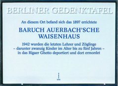 »Die Berliner Gedenktafel erinnert an das Baruch Auerbach´sche Waisenhaus, das es nicht mehr gibt. Mit der Deportation der letzten Lehrer und Zöglinge nach Riga 1942 und ihrer anschließenden Ermordung ist auch die Institution ausgelöscht worden, die Schulgebäude fielen später dem Krieg zum Opfer. Die nachfolgende Überbauung des Geländes lässt kaum noch eine Erinnerung an diesen historischen Ort zu. Diese Gedenktafel soll an die Bedeutung erinnern, die das Baruch Auerbach´sche Waisenhaus nicht nur für das jüdische Berlin hatte. Daneben gilt es, auch die Institutionen und die Leistung seines Urhebers zu würdigen. [...] Der in Westpreußen geborene Baruch Auerbach richtete 1833 im Gebäude der Knabenschule der Berliner Jüdischen Gemeinde ein Waisenhaus für Knaben ein, das später in die Oranienburger Straße umzog. Am Standort Rosenstraße gründete er dann 1844 das erste Waisenhaus für Mädchen: Beide Einrichtungen leitete ihr Gründer bis zu seinem Tod 1864. Sie waren beispielgebend für gleichartige jüdische Einrichtungenin den deutschen Ländern.« Lesen Sie weiter in Rosemarie Baudisch/Wolfgang Ribbe, Gedenken auf Porzellan. Eine Stadt erinnert sich (Berliner Gedenktafeln), Berlin 2014, Nicolai Verlag Berlin, S. 275-277 (Zitate ebenda).