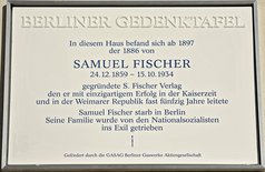 »Samuel Fischer wurde in Ungarn geboren, in einem kleinen Ort, der heute zu Slowenien gehört. Dort wuchs er auf und ging zur Schule. [...] Aus der Provinz kommend führte ihn sein Weg in die Welt. Der junge Samuel Fischer erlernte den Buchhandel in Wien und besuchte dort die Handelsschule, folgte dann aber seinem ältesten Bruder 1879 nach Berlin, wo er nach einigen Zwischenetappen mit 26 Jahren den eigenen Verlag gründete. [...] Bereits drei Jahre nach der Verlagsgründung zog Samuel Fischer mit seinem Unternehmen in die Bülowstraße 90 um [...].« Lesen Sie weiter in Rosemarie Baudisch/Wolfgang Ribbe, Gedenken auf Porzellan. Eine Stadt erinnert sich (Berliner Gedenktafeln), Berlin 2014, Nicolai Verlag Berlin, S. 333-334 (Zitate ebenda).