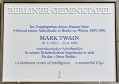 »Der gelernte Schriftsetzer Mark Twain arbeitete überwiegend als Journalist, präziser formuliert: als Reisejournalist. Seine Tagebücher, die ihn auf diesen Reisen nach Europa und auch in den Nahen Osten führten, sind ebenso sozialkritisch angelegt wie sein engeres literarisches Erzählwerk, in dem seine Protagonisten die Heuchelei und Verlogenheit der herrschenden Verhältnisse durchschauen. [...] Erst auf seiner dritten Europareise kam er im Winter 1891 auch nach Berlin. Die Wohnung in der Körnerstraße 7 hatte seine Frau Olivia angemietet. Aus Marienbad kommend war sie mit den Töchtern angereist. Das Berliner Adressbuch verzeichnet Mark Twain unter seinem bürgerlichen Namen »Samuel Langhorn Clemens, Privatier«. Lesen Sie weiter in Rosemarie Baudisch/Wolfgang Ribbe, Gedenken auf Porzellan. Eine Stadt erinnert sich (Berliner Gedenktafeln), Berlin 2014, Nicolai Verlag Berlin, S. 286-287 (Zitate ebenda).
