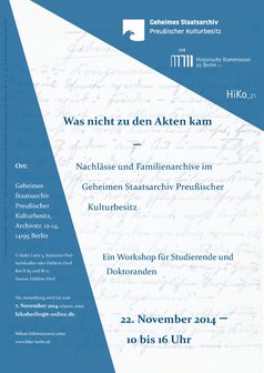 Unter der Federführung von Frau Dr. Schnelling-Reinicke kamen am 22. November 2014 26 Studierende und Doktoranden zusammen, um an zehn ausgewählten (Teil)-Nachlässen des Geheimen Staatsarchivs Preußischer Kulturbesitz zu arbeiten.
