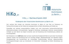 Zum sechsten Mal schrieb die Historische Kommission zu Berlin e.V. den Preis zur Förderung von Nachwuchsforschungen auf dem Gebiet der Landesgeschichte von Berlin, Brandenburg und Preußen aus. Förderfähig sind laufende wissenschaftliche Projekte (Dissertationsvorhaben, Archivaufenthalte, Tagungen & Workshops, Ausstellungen, Editionen, wissenschaftliche Vorhaben aus dem Bereich der Digital Humanities oder die Finanzierung einer Kinderbetreuung während der Forschungsarbeit). Der Preis ist mit 2.000 Euro dotiert und kann sowohl einer Einzelpersönlichkeit als auch einem Forscherteam zuerkannt werden. Bewerbungsfrist war der 15. Mai 2023.