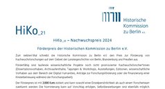 Zum siebten Mal schrieb die Historische Kommission zu Berlin e.V. den Preis zur Förderung von Nachwuchsforschungen auf dem Gebiet der Landesgeschichte von Berlin, Brandenburg und Preußen aus. Förderfähig sind laufende wissenschaftliche Projekte noch nicht promovierter Nachwuchsforscher*innen (Dissertationsvorhaben, Archivaufenthalte, Tagungen & Workshops, Ausstellungen, Editionen, wissenschaftliche Vorhaben aus dem Bereich der Digital Humanities, Anträge zur Forschungsförderung oder die Finanzierung einer Kinderbetreuung während der Forschungsarbeit). Bewerbungsfrist war der 15. Mai 2024.