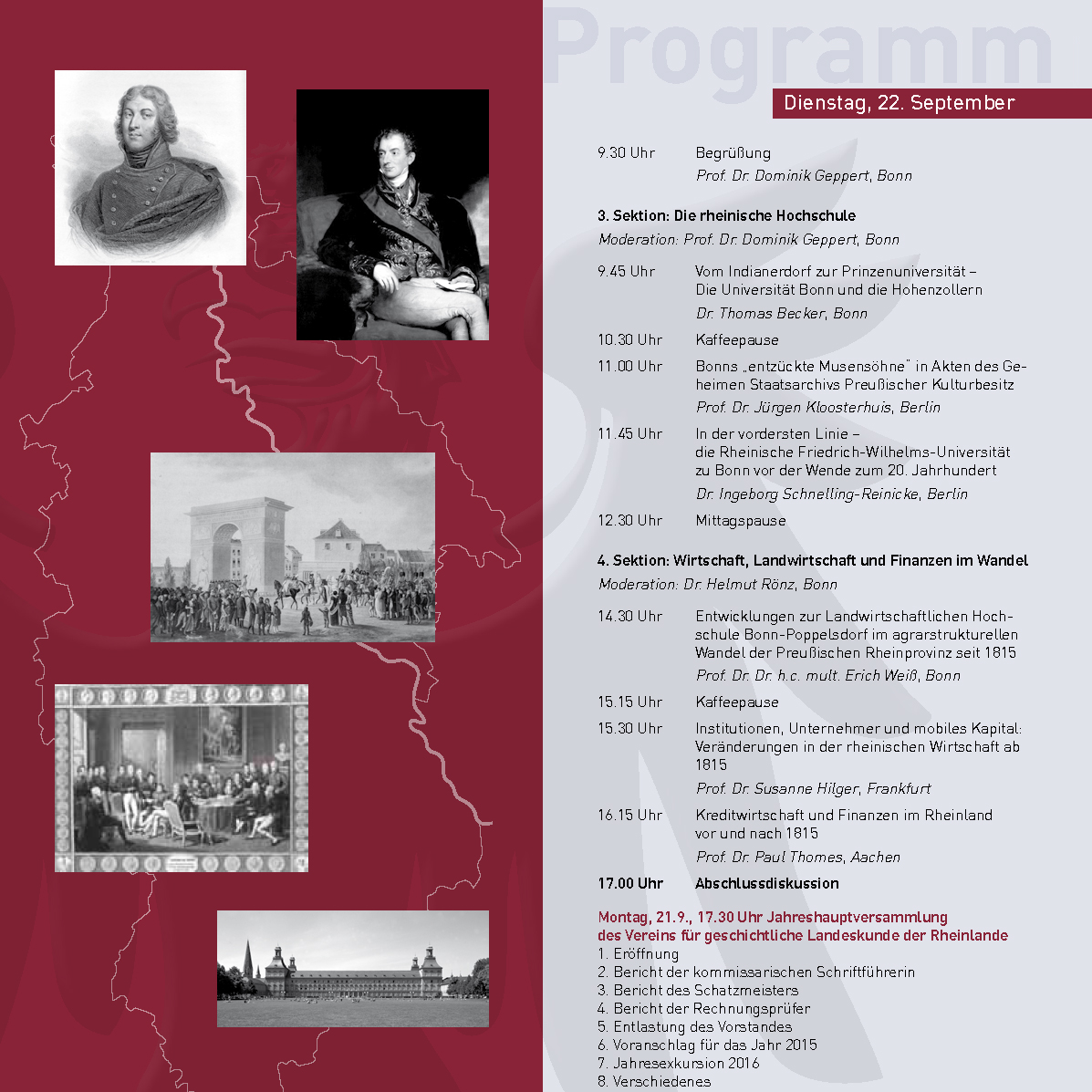 Die Ereignisse um 1815 sowie der Wiener Kongress markieren eine der großen Zäsuren der europäischen Geschichte. Es entstand eine neue Friedensordnung für Europa, die bis weit in die zweite Hälfte des 19. Jahrhunderts Bestand haben sollte. Ferner wurde die Karte Europas neu gezeichnet, einhergehend mit territorialem Zugewinn für Preußen. Welche überregionalen Kräfte wirkten, als die ‚Rheinlande‘ zu Preußen kamen, welche Veränderungen der Übergang mit sich brachte und welche Bereiche des öffentlichen, wirtschaftlichen und kulturellen Lebens dabei betroffen waren, haben die Vorträge beleuchtet.