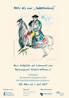 Gemeinsam mit der Historischen Kommission zu Berlin e.V. veranstaltete das Geheime Staatsarchiv Preußischer Kulturbesitz vom 30. März bis zum 1. April 2017 im GStA PK die Tagung ‚Mehr als nur ,Soldatenkönig‘ — Neue Schlaglichter auf Lebenswelt und Regierungswerk Friedrich Wilhelms I.‘ Die Tagung vereinte klassische Themen zur preußischen Außen-, Innen- und Konfessionspolitik mit neuen kulturgeschichtlichen Forschungsansätzen, insbesondere auch zu Frauen im Umfeld des Monarchen. Aus den Referaten, die ebenso von ausgewiesenen FW I.-Experten wie von Doktorandinnen und Doktoranden gehalten werden, ergaben sich viele neue Facetten, die zur weiteren Aufhellung der Historiographie über diesen ‚König im Schlagschatten‘ jenseits der vorherrschenden Klischees beitragen können.